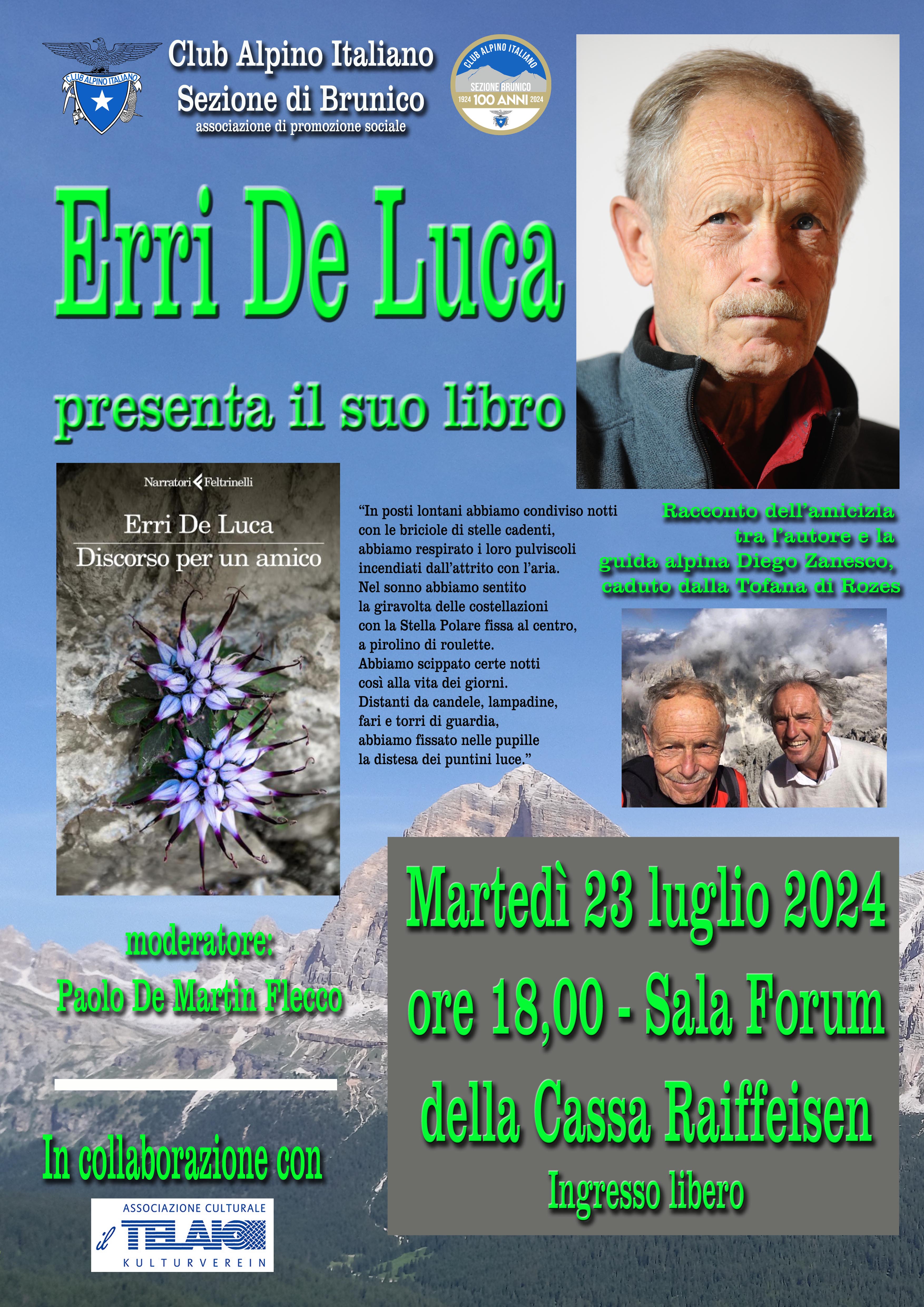 Il grande scrittore, giornalista e poeta Erri De Luca, autore di svariati libri, molti dei quali dedicati alla montagna e all’alpinismo, sarà a Brunico (BZ) il 23 luglio per presentare la sua ultima fatica “Discorso per un amico” (Feltrinelli, 2024) è il racconto dell’amicizia tra
