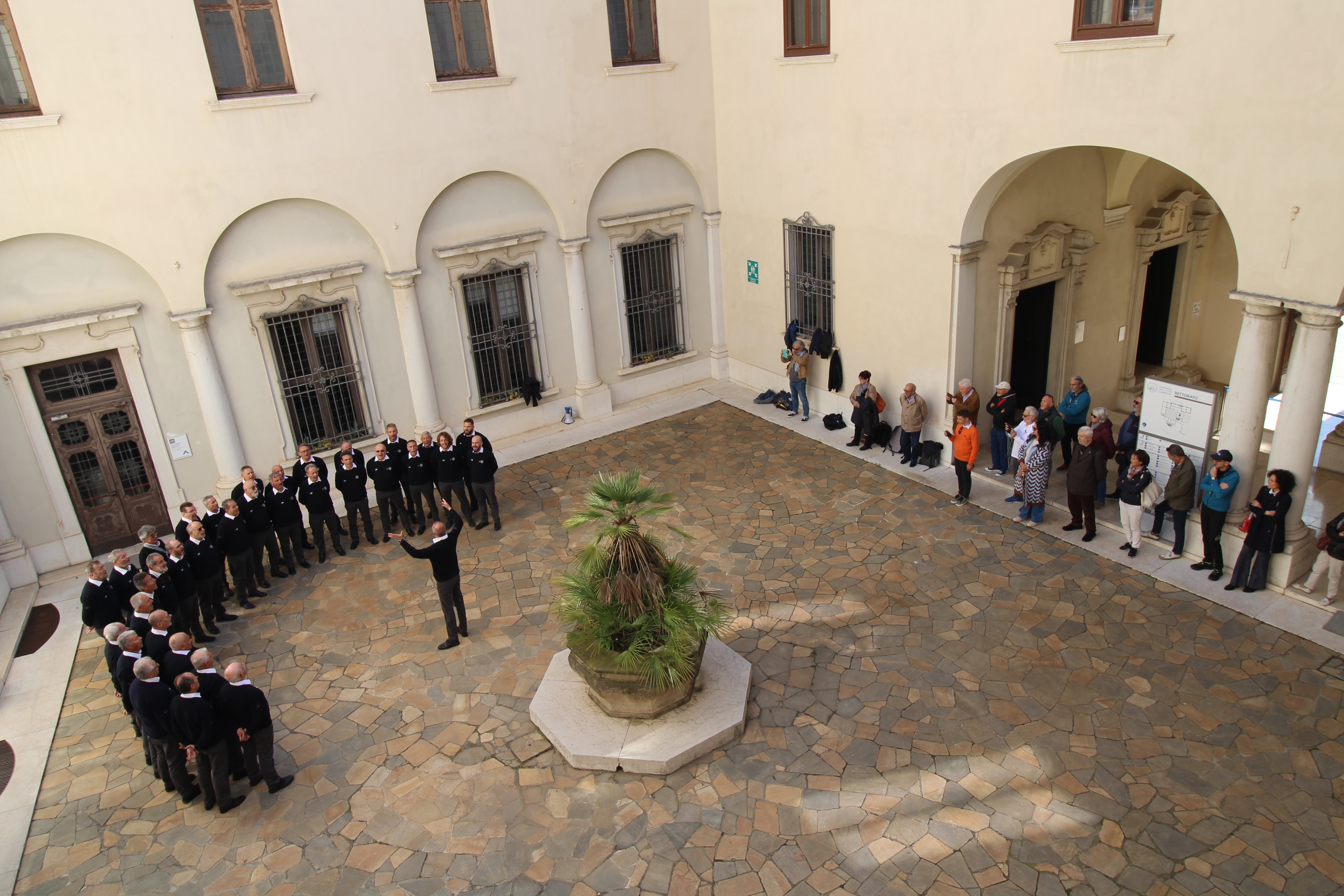 Il Coro Cai Sondrio nel cortile del Rettorato dell' Università di Brescia © Cai SondrioMemorabile e storica partecipazione della Coralità Cai al 2° Memorial Gabriele Bianchi, maratona corale-culturale svoltasi in terra bresciana con quattro cori: il Coro Cai Sondrio con il maestro Michele Franzina, il Coro Is.Ca di Iseo con il maestro Ferdinando Mottinelli, il Coro Cai Melegnano con la maestra Silvia Berardi, il Coro Sibilla- Cai di Macerata con il maestro Fabiano Pippa.