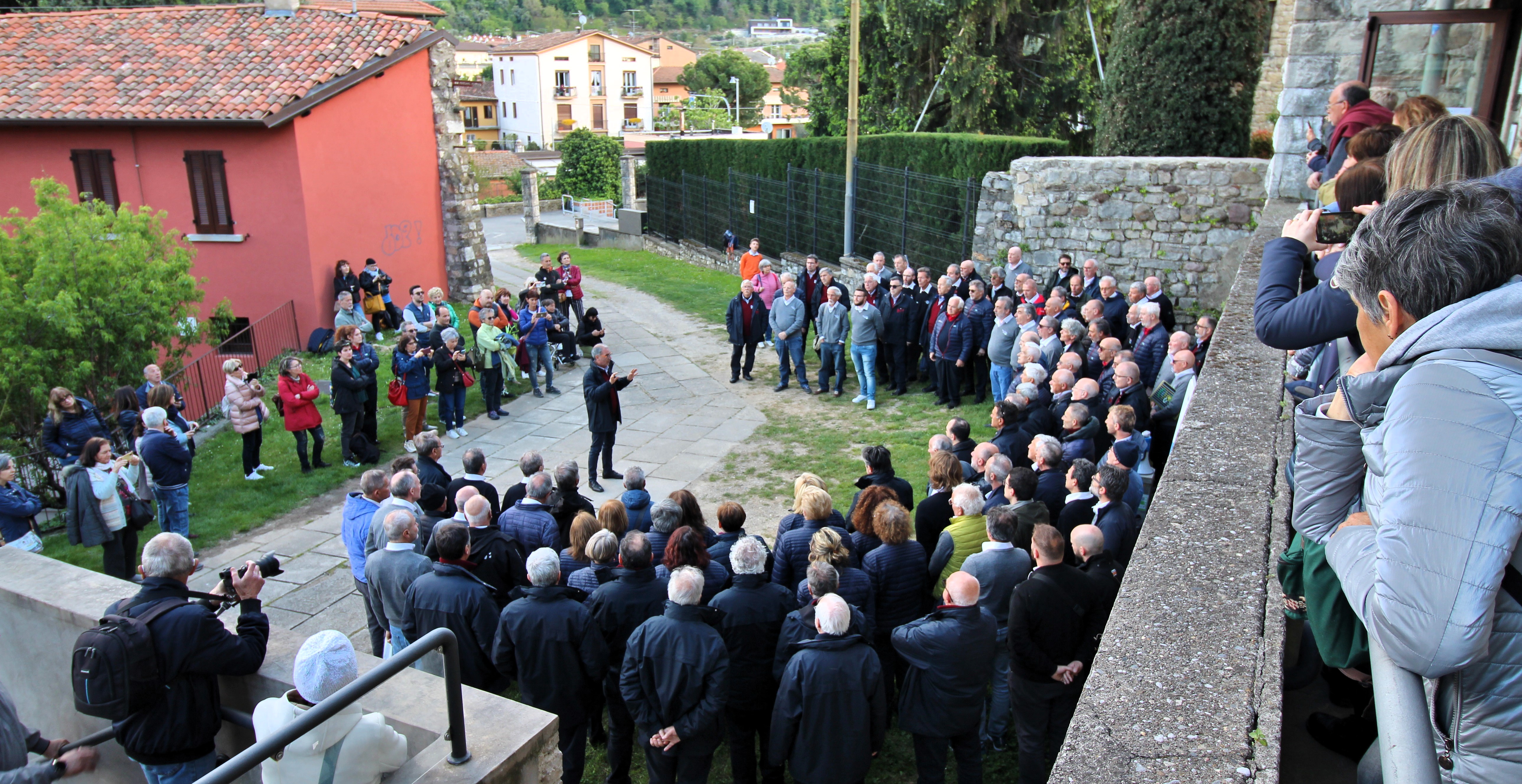 I quattro cori cantano ai piedi del Castello di Iseo © Cai SondrioNel pomeriggio, dalle 16 alle 18,15 dopo lo spostamento in pullman ad Iseo sono intervenuti tutti e quattro i cori, ciascuno con quattro canti nella seconda fase del Memorial, “Cori in città”, quella itinerante nella bella cittadina sulle rive del lago Sebino, dopo il saluto augurale dell’assessore comunale Maria Angela Premoli : da piazza Zanardelli a piazza Garibaldi, fino su all’imponente Castello Oldofredi ai piedi del quale i cori uniti hanno eseguito il canto de “La Montanara” con la direzione del maestro del Coro Sibilla- Cai Macerata Fabiano Pippa. I cori si sono infine spostati alla chiesa di S. Andrea davanti alla quale ancora uniti hanno cantato “Signore delle cime” con la direzione del maestro del Coro IS.CA di Iseo Ferdinando Mottinelli.